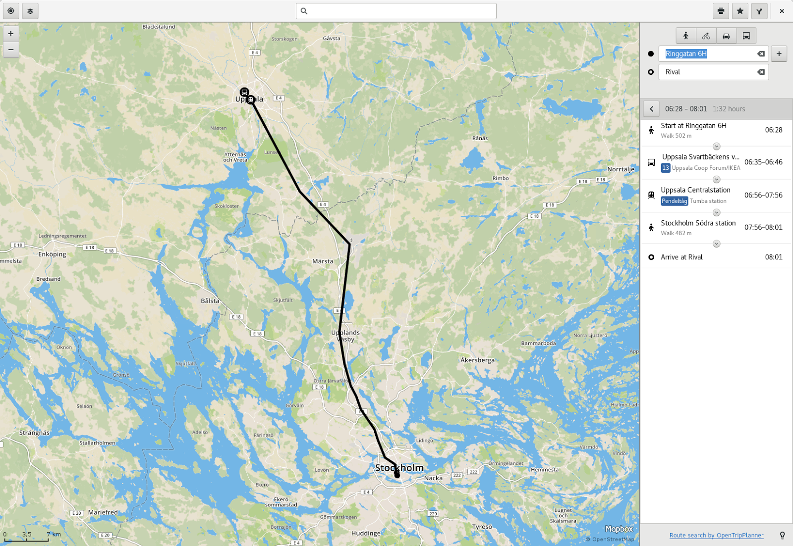 Here I have entered the time a which I would at the latest want to arrive and entered the start and destination, so I've gotten some alternatives. Notice how now the trips are ordered by arrival time, and in reverse time order (so to speak). This was a behavior that one of Andreas' test panel persons commented on: ”This is different from Google, but I actually like it better this way!“.
